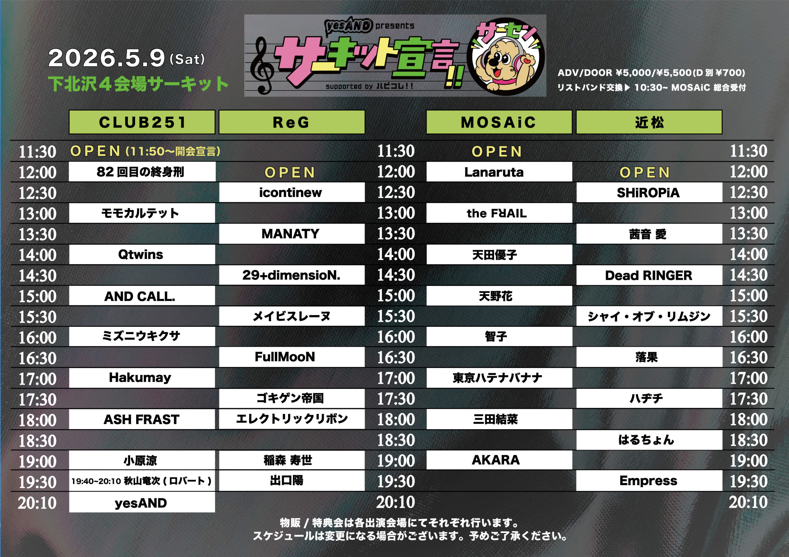 【会場】下北沢 CLUB251 / MOSAiC / ReG / 近松 (4会場サーキット)